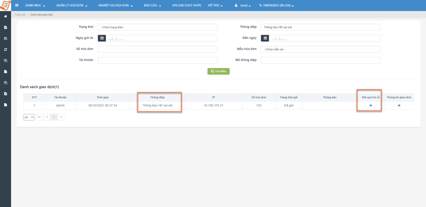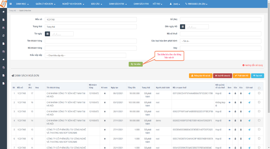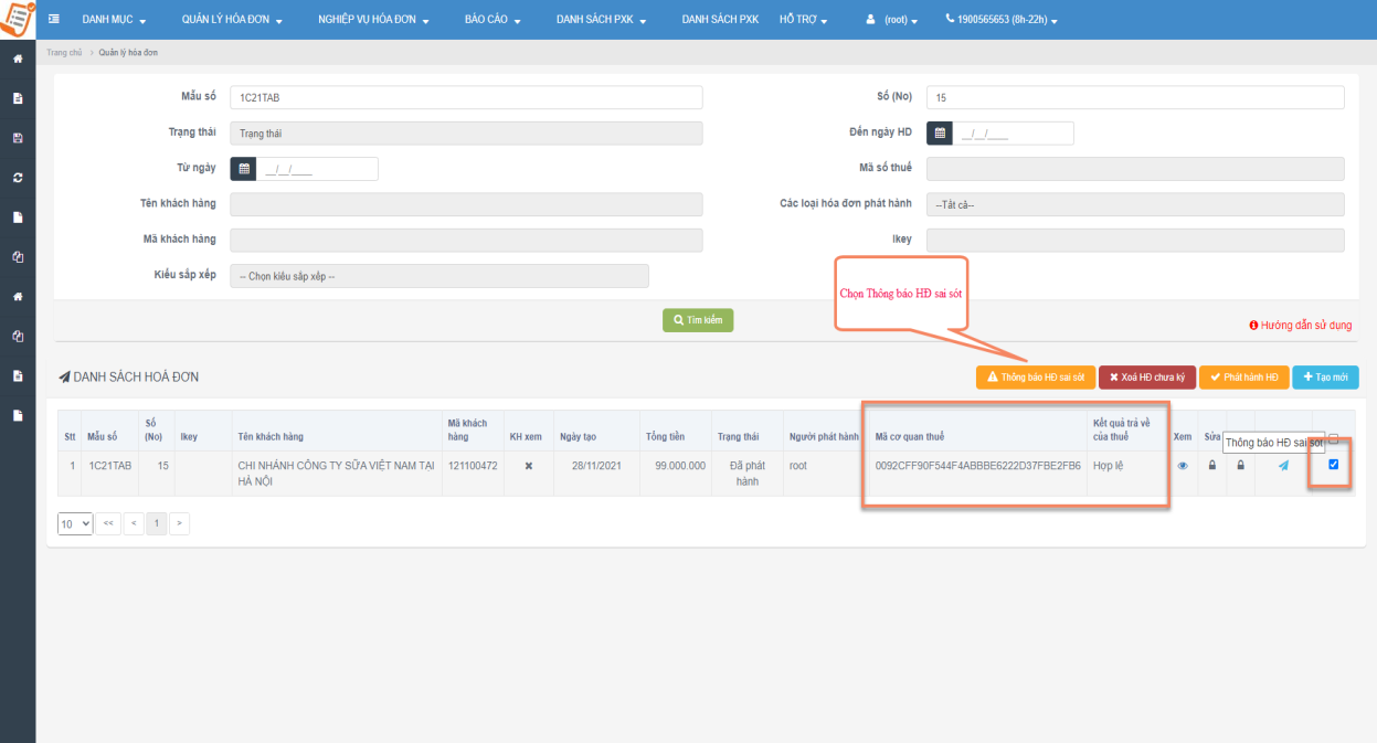 Bước 1: Tại màn danh sách hóa đơn tìm kiếm hóa đơn cần lập thông báo sai sót