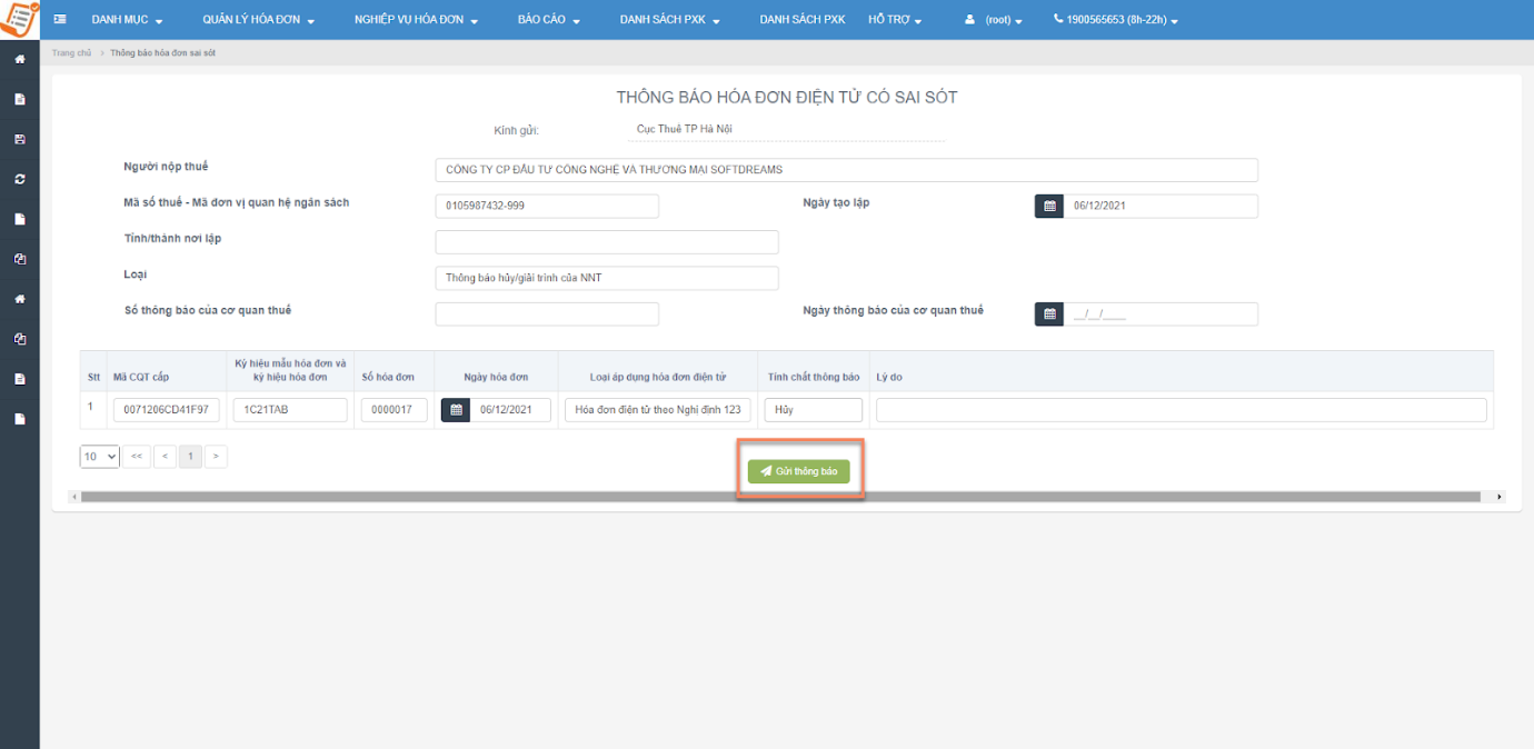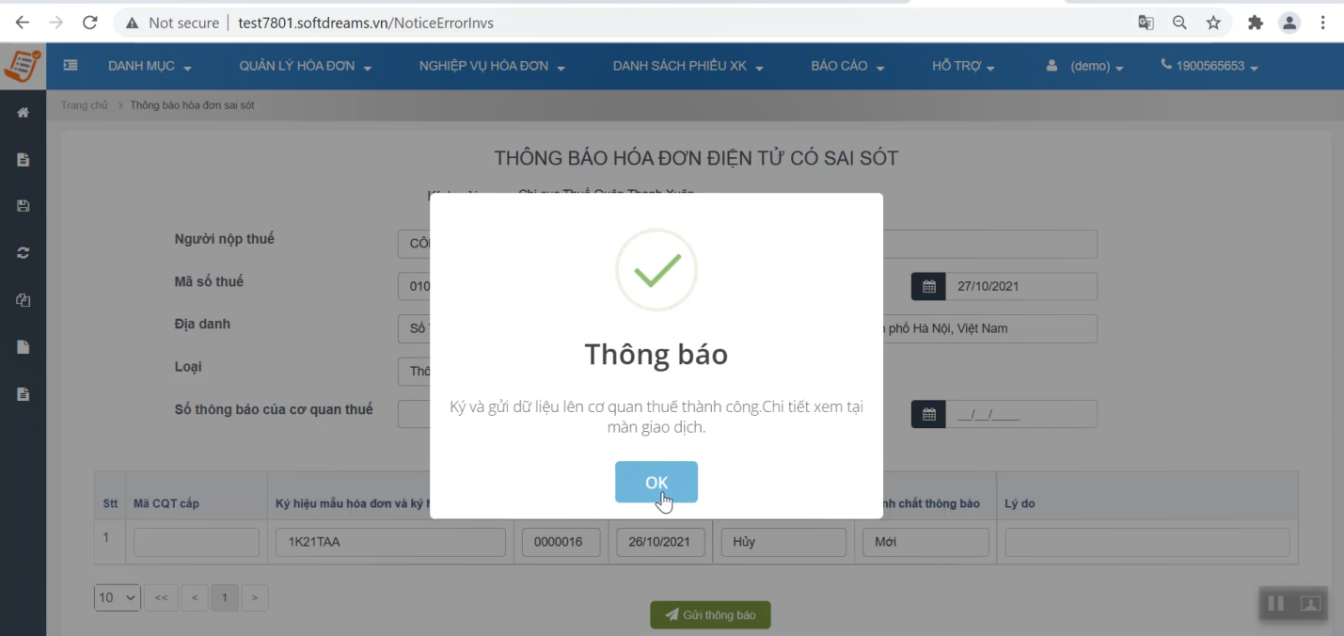 Ký và gửi lên CQT thành công, hệ thống đưa thông báo