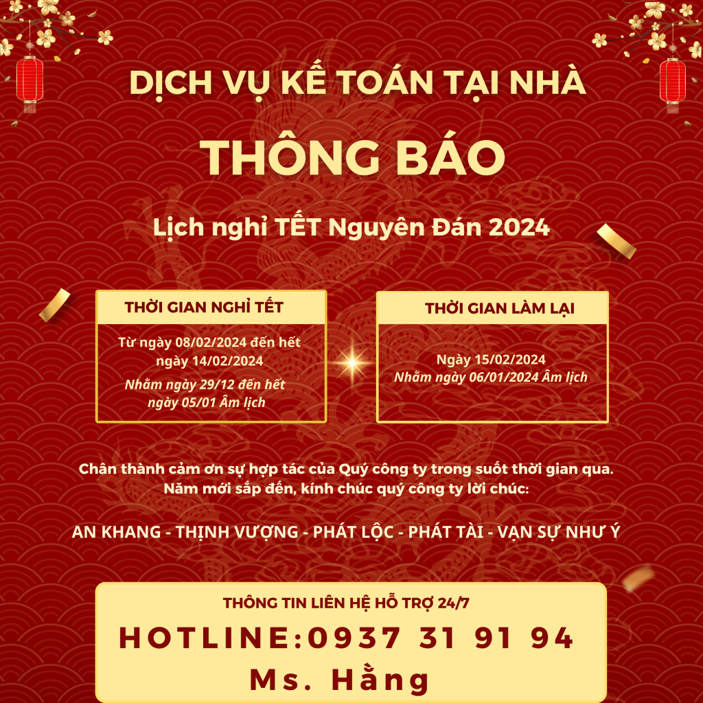 Tin Tức Thông báo lịch nghỉ Tết Nguyên Đán 2024 của Dịch Vụ Kế Toán Tại Nhà – Kế Toán Bán Thời Gian Posted on 30/01/2024 by dvkthang