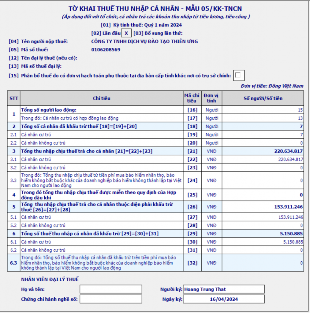 ♦ Tại điểm 9.9 khoản 9 Phụ lục I – Danh mục hồ sơ khai thuế ban hành kèm theo Nghị định số 126/2020/NĐ-CP ngày 19/10/2020 của Chính phủ quy định:“9.9. Hồ sơ khai thuế của tổ chức, cá nhân trả thu nhập khấu trừ thuế đối với tiền lương, tiền cônga) Hồ sơ khai thuế tháng, quý Tờ khai thuế thu nhập cá nhân (áp dụng đối với tổ chức, cá nhân trả các khoản thu nhập từ tiền lương, tiền công) mẫu số 05/KK-TNCN.”